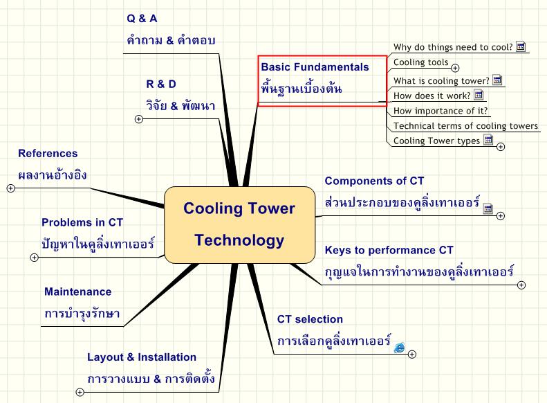 Why do things need to cool? Cooling tools What is cooling tower? How does it work? How importance of it? Technical terms of cooling towers Cooling Tower types Components of CT ส่วนประกอบของคูลิ่งเทาเออร์ Keys to performance CT กุญแจในการทำงานของคูลิ่งเทาเออร์ CT selection การเลือกคูลิ่งเทาเออร์ Layout & Installation การวางแบบ & การติดตั้ง Problems in CT ปัญหาในคูลิ่งเทาเออร์ References ผลงานอ้างอิง R & D วิจัย & พัฒนา Components of CT ส่วนประกอบของคูลิ่งเทาเออร์ Keys to performance CT กุญแจในการทำงานของคูลิ่งเทาเออร์ CT selection การเลือกคูลิ่งเทาเออร์ Layout & Installation การวางแบบ & การติดตั้ง Maintenance การบำรุงรักษา Problems in CT ปัญหาในคูลิ่งเทาเออร์ References ผลงานอ้างอิง R & D วิจัย & พัฒนา Q & A คำถาม & คำตอบ Cooling Tower Technology