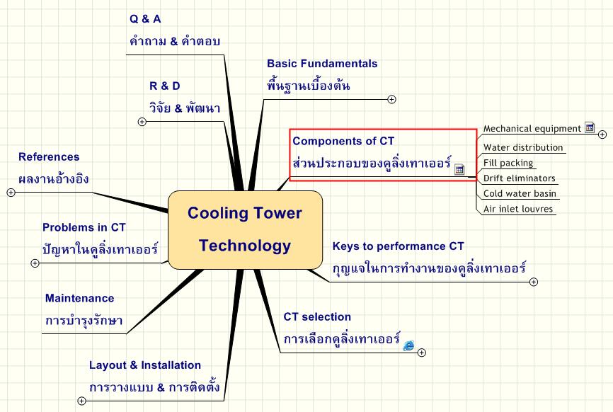 Components of CT Mechanical equipment Water distribution Fill packing Drift eliminators Cold water basin Air inlet louvres Basic Fundamentals พื้นฐานเบื้องต้น Keys to performance CT กุญแจในการทำงานของคูลิ่งเทาเออร์ CT selection การเลือกคูลิ่งเทาเออร์ Layout & Installation การวางแบบ & การติดตั้ง Problems in CT ปัญหาในคูลิ่งเทาเออร์ References ผลงานอ้างอิง R & D วิจัย & พัฒนา Basic Fundamentals พื้นฐานเบื้องต้น Keys to performance CT กุญแจในการทำงานของคูลิ่งเทาเออร์ CT selection การเลือกคูลิ่งเทาเออร์ Layout & Installation การวางแบบ & การติดตั้ง Maintenance การบำรุงรักษา Problems in CT ปัญหาในคูลิ่งเทาเออร์ References ผลงานอ้างอิง R & D วิจัย & พัฒนา Q & A คำถาม & คำตอบ Cooling Tower Technology